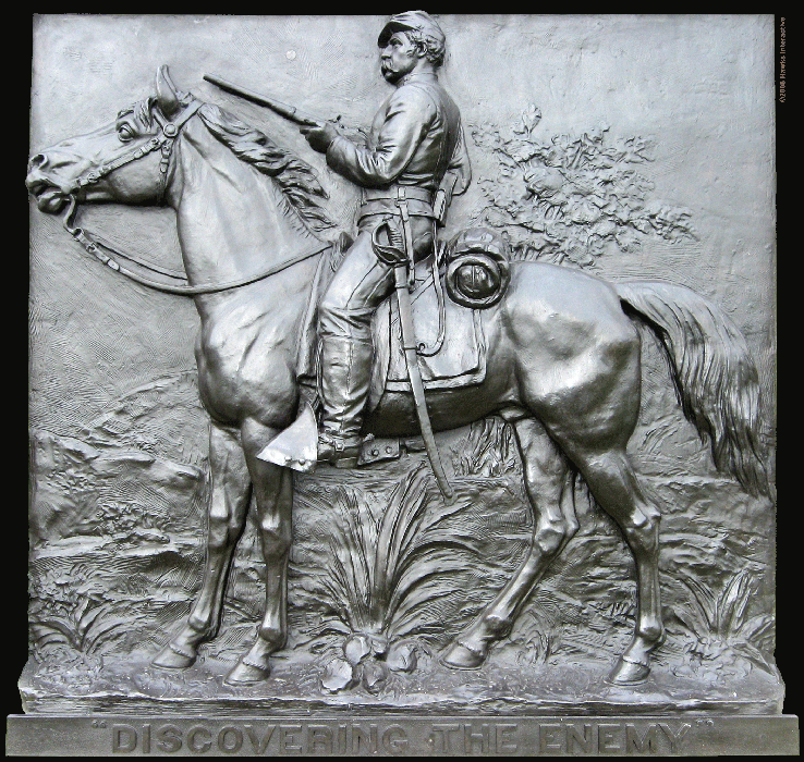 The 9th New York Cavalry (map) was one of two cavalry regiments picketing the west side of Gettysburg on July 1 that claimed to have fired the first shot of the Battle of Gettysburg. “Discovering the Enemy” by sculptor Caspar Buberl shows Lieutenant Alphonse Hodges about to make that shot. The ‘First Shot Controversy‘ continues to this day.
