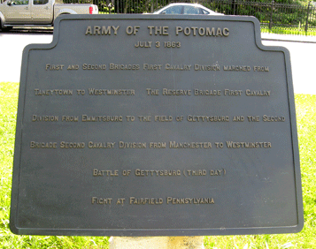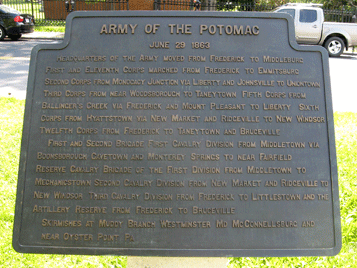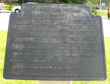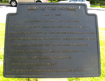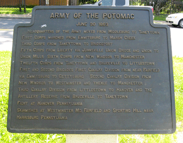 In the early 1900s the War Department placed nine makers detailing the activities of the Army of the Potomac from June 29 until July 7, 1863 across from Evergreen Cemetery facing Baltimore Pike. After years of absence, they were reinstalled in 2008 a few yards down the street and, in a concession to modern traffic, facing away from busy Baltimore Pike.
