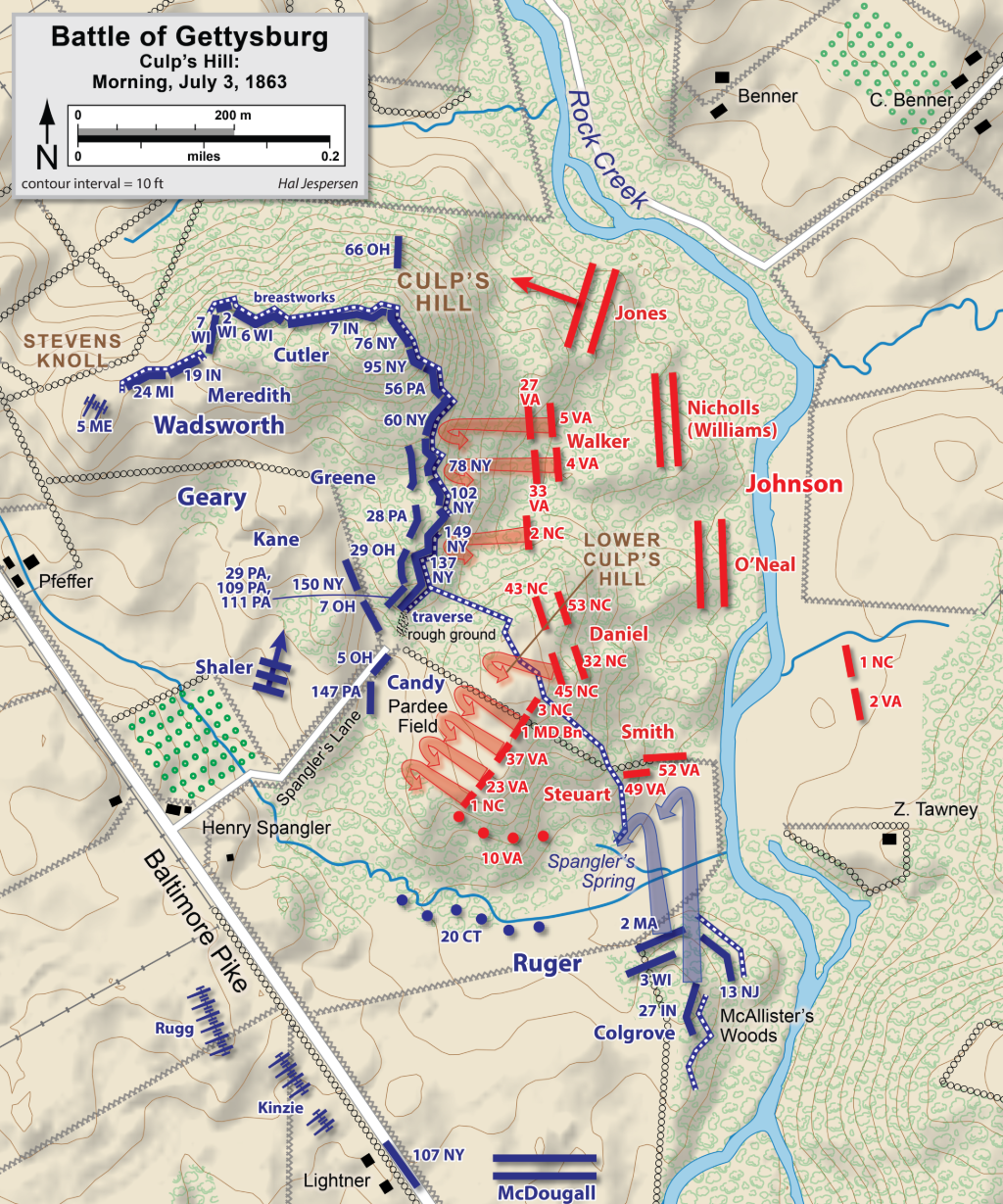 Reinforcements joined the Confederate attack. Robert Rodes sent Edwin O’Neal’s Alabama Brigade to reinforce the Louisianans on Upper Culp’s Hill. Walker’s Stonewall Brigade, which had been guarding the Second Corps’ flank, was freed up to join Steuart on the lower hill when Jeb Stuart’s cavalry finally took over flank duties after its very late arrival on the July 2. Johnson renewed his attack all along the line.