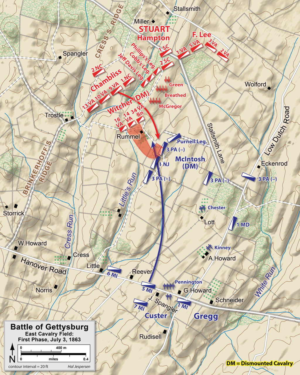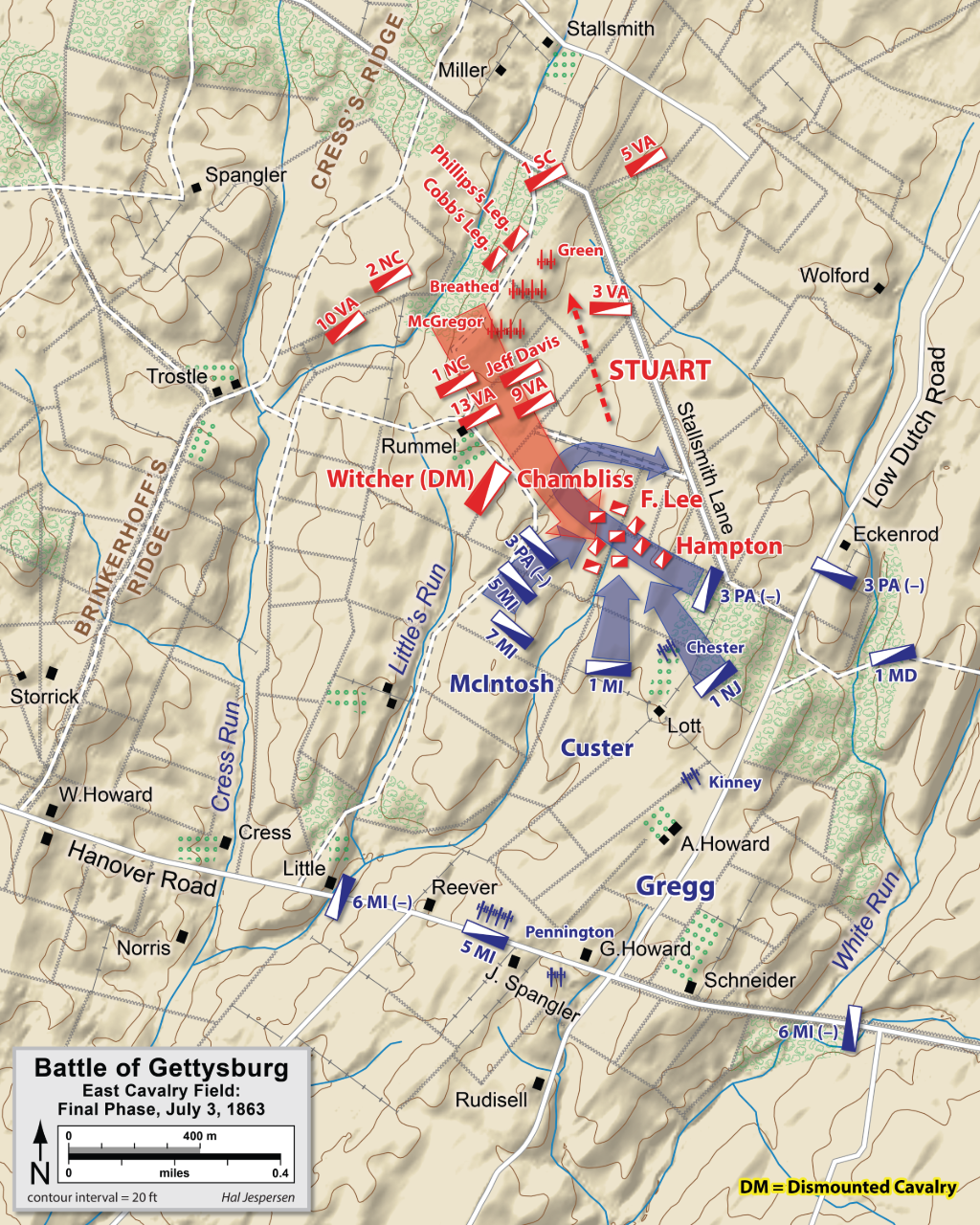 As the final preparations were underway for Pickett’s Charge, Jeb Stuart led four cavalry brigades around the Union flank: Wade Hampton’s, Fitzhugh Lee’s, W.H.F. Lee’s (commanded by John Chambliss) and Albert Jenkins’ (commanded by Milton Ferguson). They were about four miles east of Gettysburg. Stuart hoped to make his way around the Union flank and into the rear of Meade’s army to cut his supply line and line of retreat. This would put the Confederate cavalry in an excellent position to disrupt retreating Union troops should Pickett’s Charge be a success. Stuart fired four guns in quick succession as a signal that he was in position.