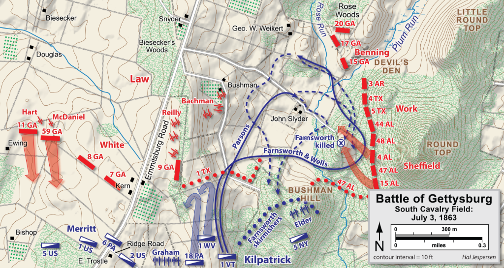 On the south end of the battlefield Union Brigadier General Judson Kilpatrick had been ordered by Union cavalry commander Alfred Pleasonton to “press the enemy.” Kilpatrick had Brigadier General Elon Farnsworth’s Brigade of cavalry from his own division. His other brigade under Custer had been detached for the fight against Stuart east of town, so he had been loaned Brigadier General Wesley Merritt’s Reserve Brigade of the First Cavalry Division.