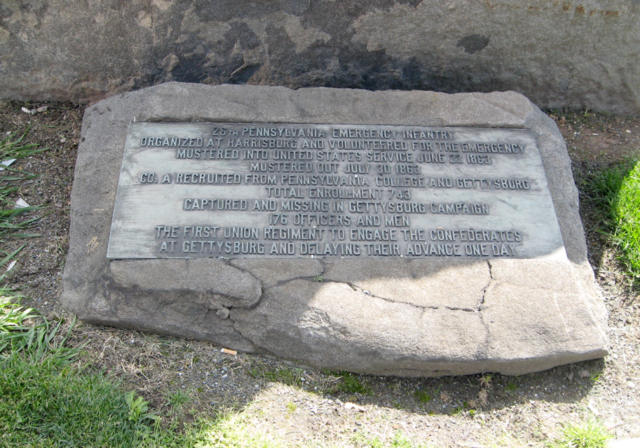 The monument to the 26th Pennsylvania Emergency Militia Infantry is on the west side of Gettysburg at the intersection of Chambersburg Street, West Street and Springs Avenue. A tablet showing where the regiment met Early’s Confederates is three miles west of town on the north side of US 30.